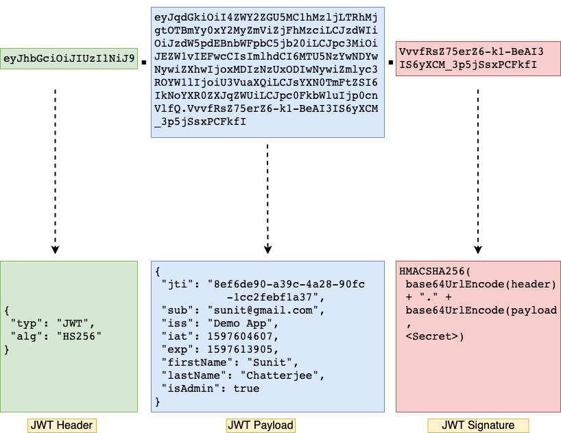 Let’s look at below image on how a given sample JWT looks like when broken into its parts.
