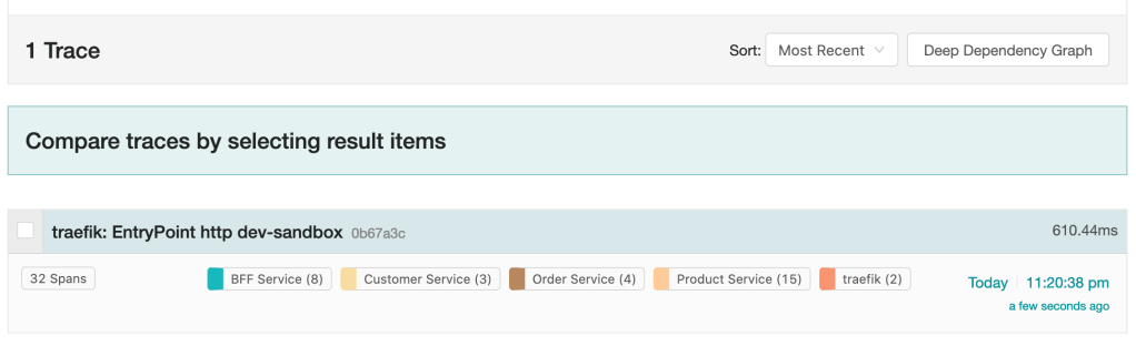 You can see complete trace, with each service call and the time it took