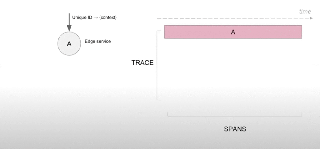 Each trace starts by passing a context that is carried forward in each of the spans. Take a look at below animation on how each call from A -> B -> C, etc each create an individual span for the trace.
