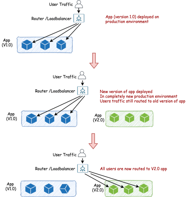 - When application team has confidence on the stability of the new environment, the loadbalancer/router then routes all user traffic to the new application.