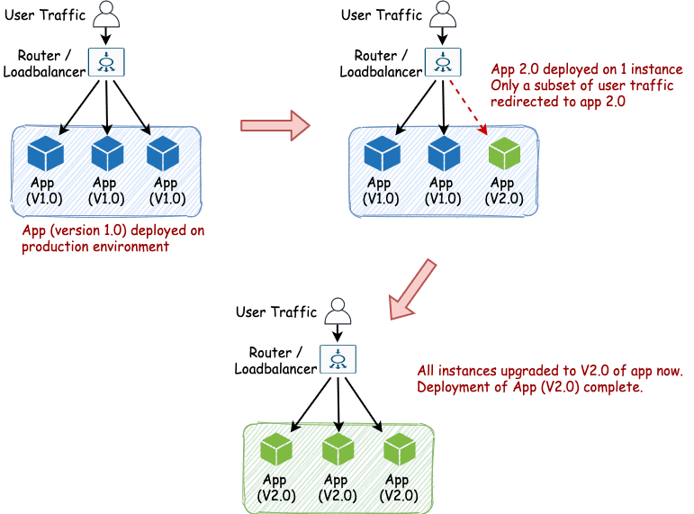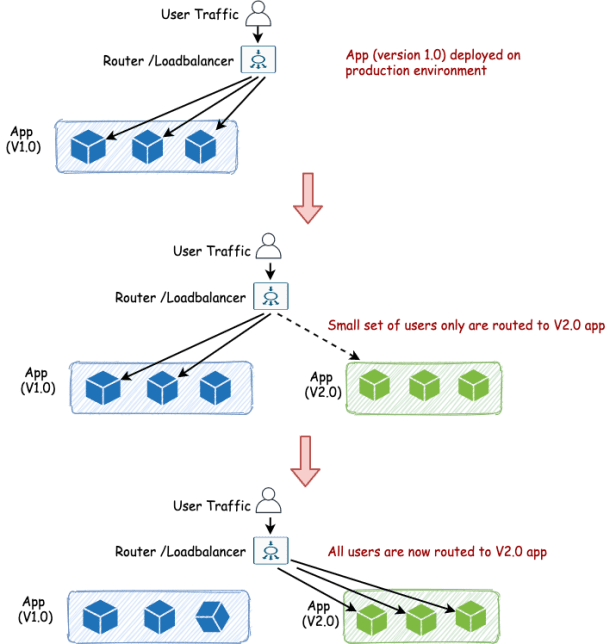 - Instead of making the new application version completely live – only a subset of users are slowly moved to the new application.