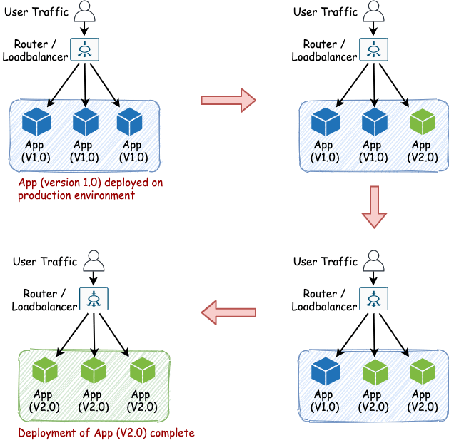 - It is a phased manner of deployment, where new version of application is deployed on the production servers one at a time in a rolling fashion.