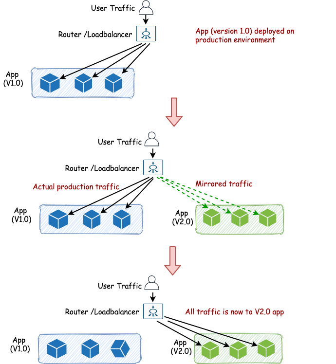 - However the entire user traffic is routed to both new and old applications – basically fork out all incoming requests to older application and send them to newer application.
