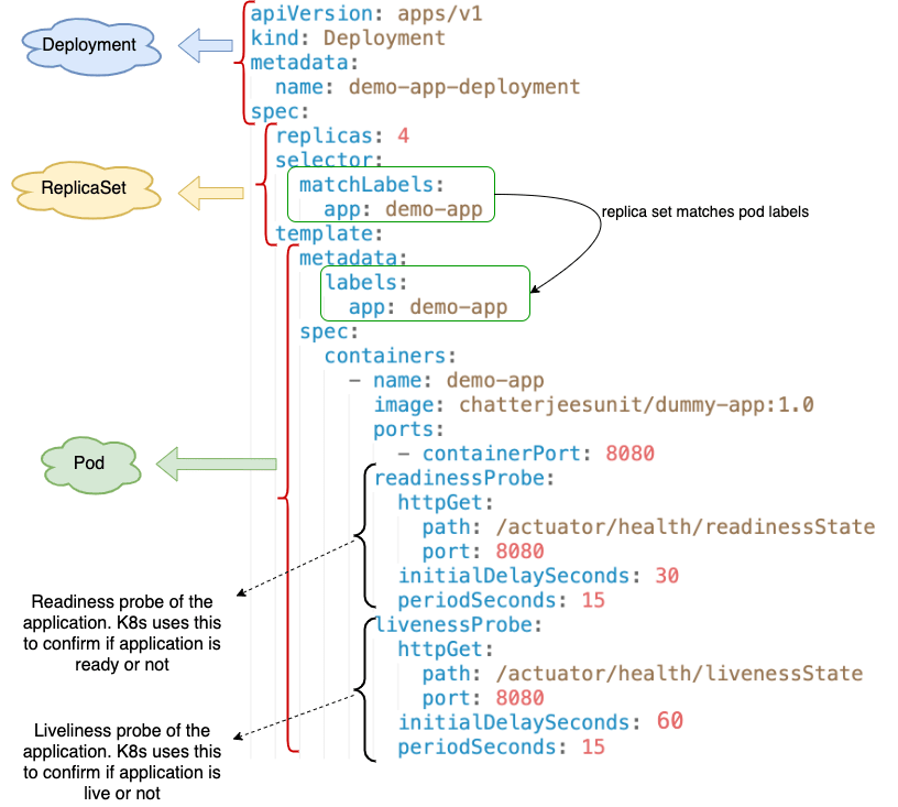 — readiness/liveness urls of the application – probes start afterinitialDelaySeconds, and are repeated everyperiodSeconds.
