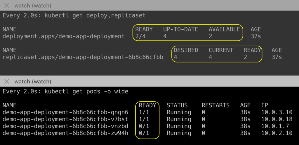 Initially you may see an output like this when you fetch pod / replicaset / deploy information (pods are created but not ready)