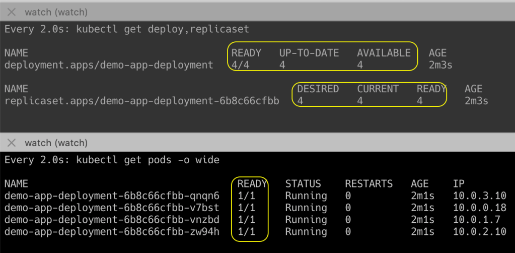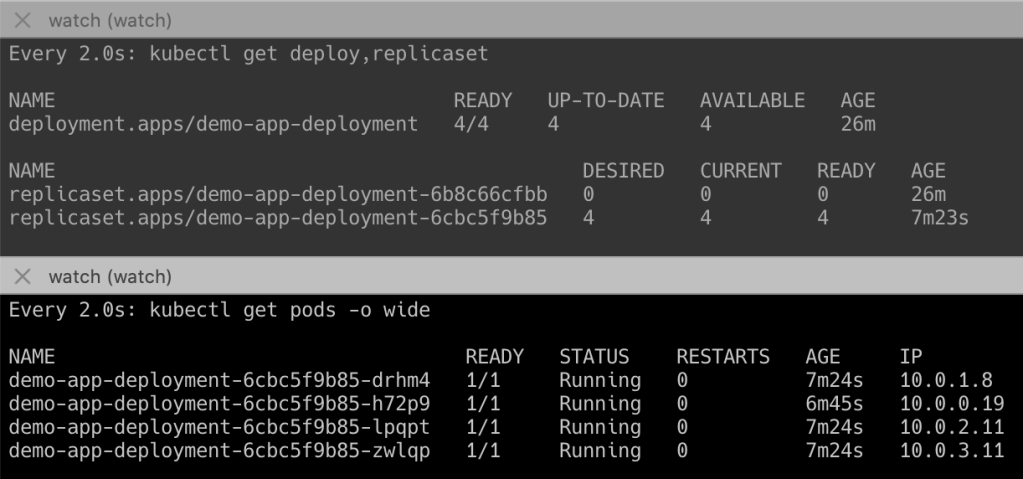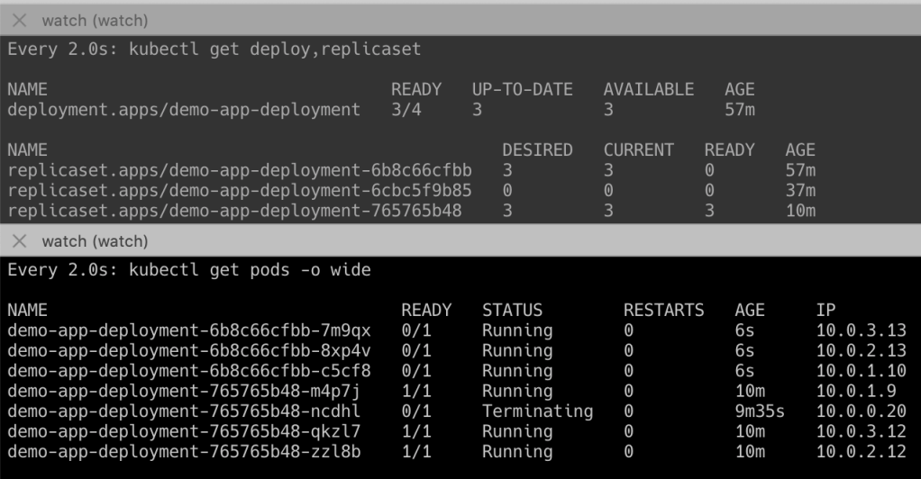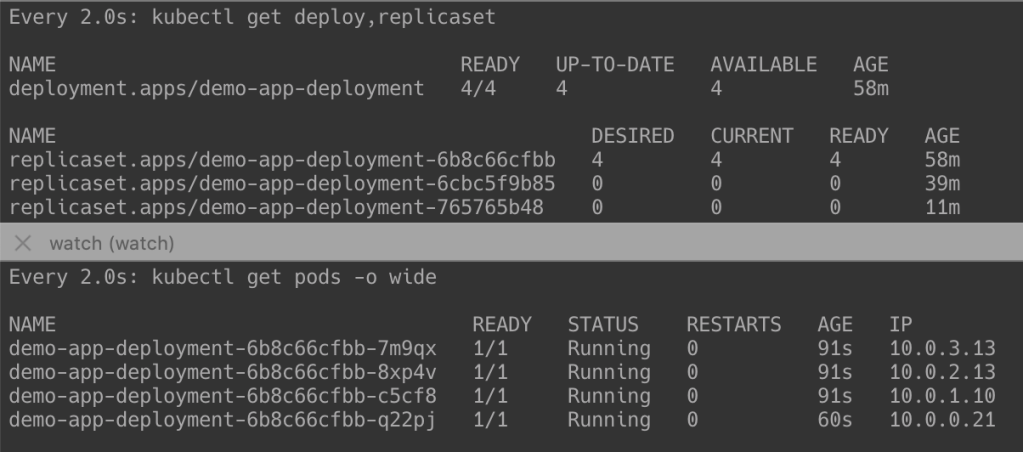 Once the deployment completes, you can see something like this below (i.e., pods in old Replicaset = 0)