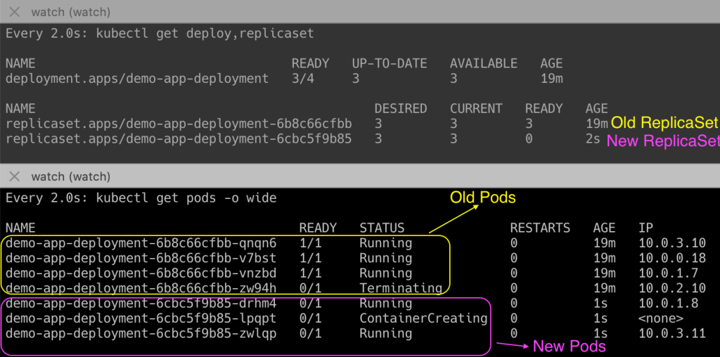 After you deploy the application you can see that pods will start getting terminated in old ReplicaSet, and created in new ReplicaSet