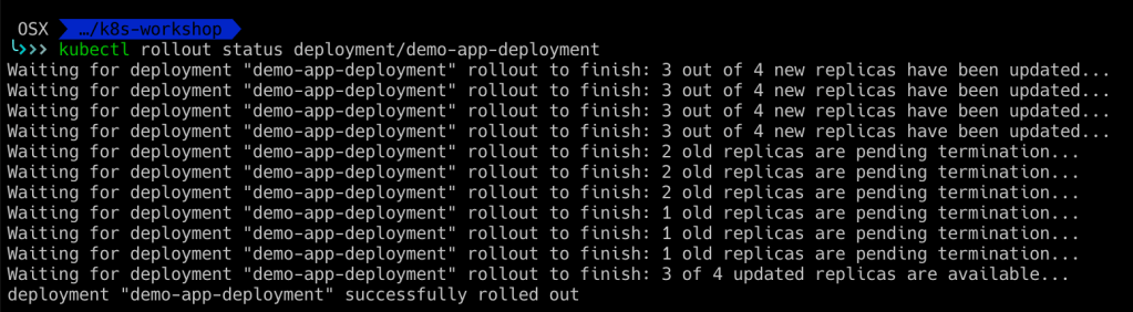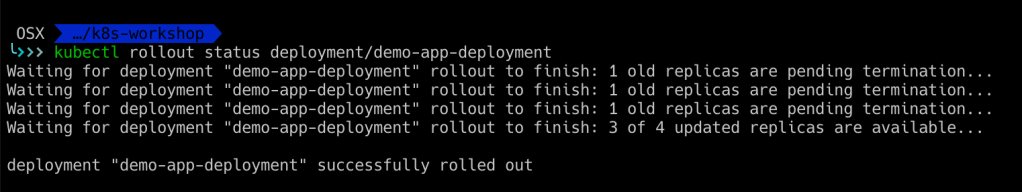 You can also view status of rollback using command – kubectl rollout status <deployment-name>