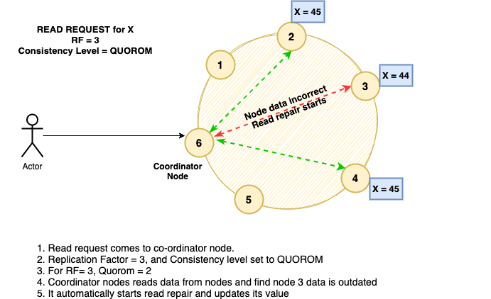 - If the co-ordinator nodes finds that one of the read-node’s data is inconsistent it automatically provides it with most recent version of data.
