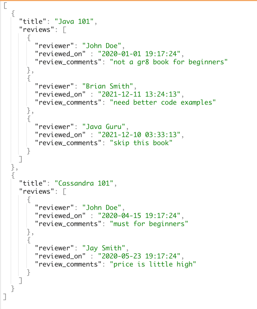 Let’s take an example of catalog of books and its reviews – and then understand how the data storage schema will vary across different types of databases.